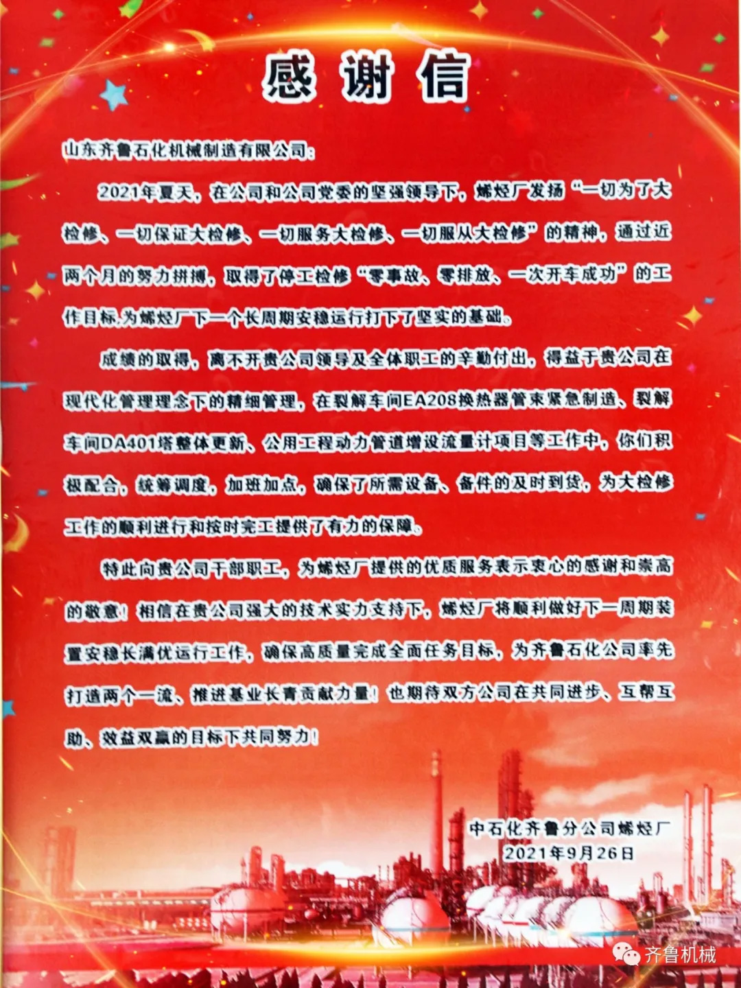 2021年9月30日中國石化齊魯分公司烯烴廠設備科副科長丁文岳、設備科許潔為公司送來感謝信,感謝機械公司全體員工在檢修期間響應號召,積極配合,加班加點,攻堅克難,全力保障檢修,確保維修設備及更新設備及時準確的供應。